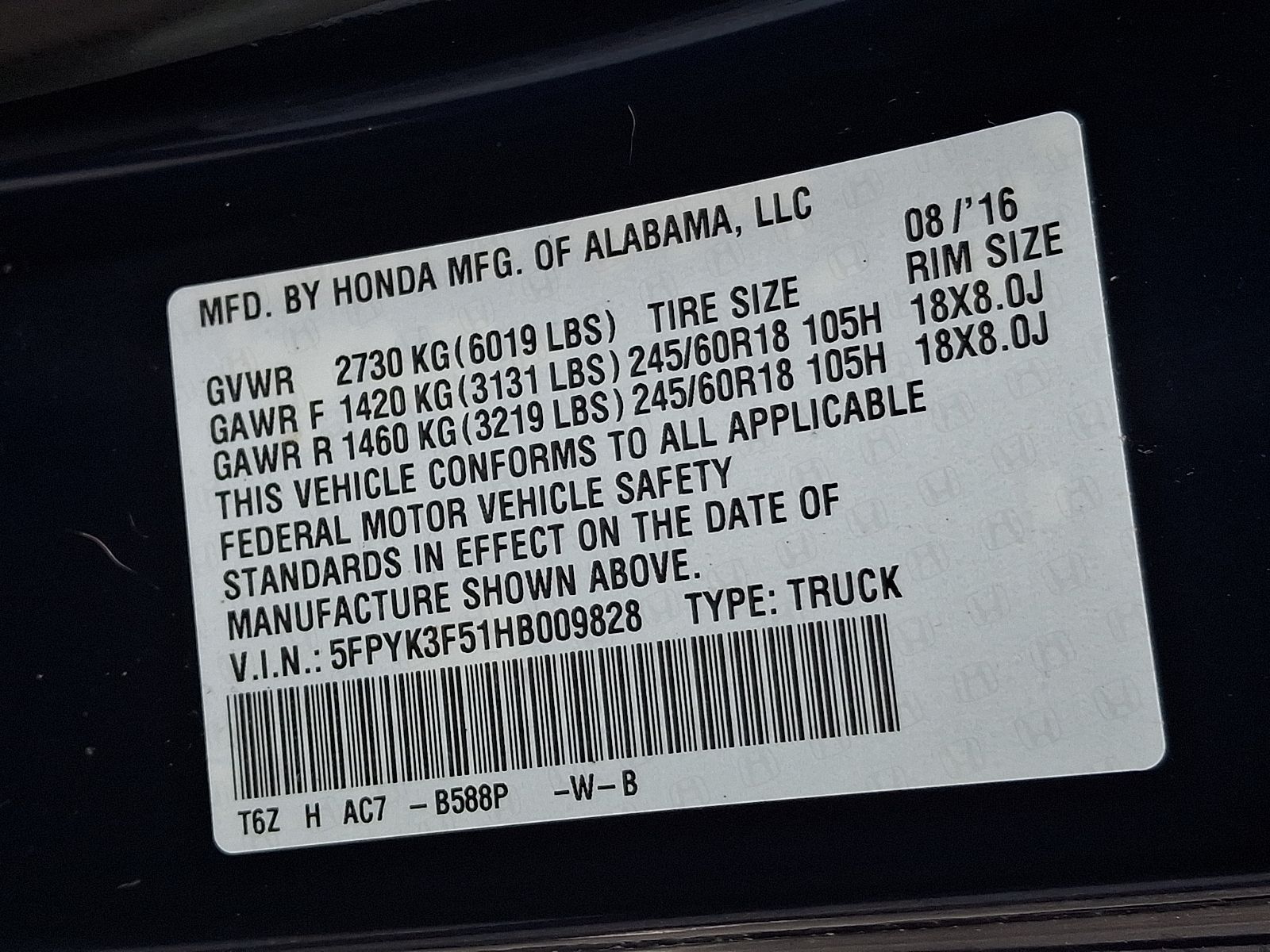 VIN 5FPYK3F51HB009828